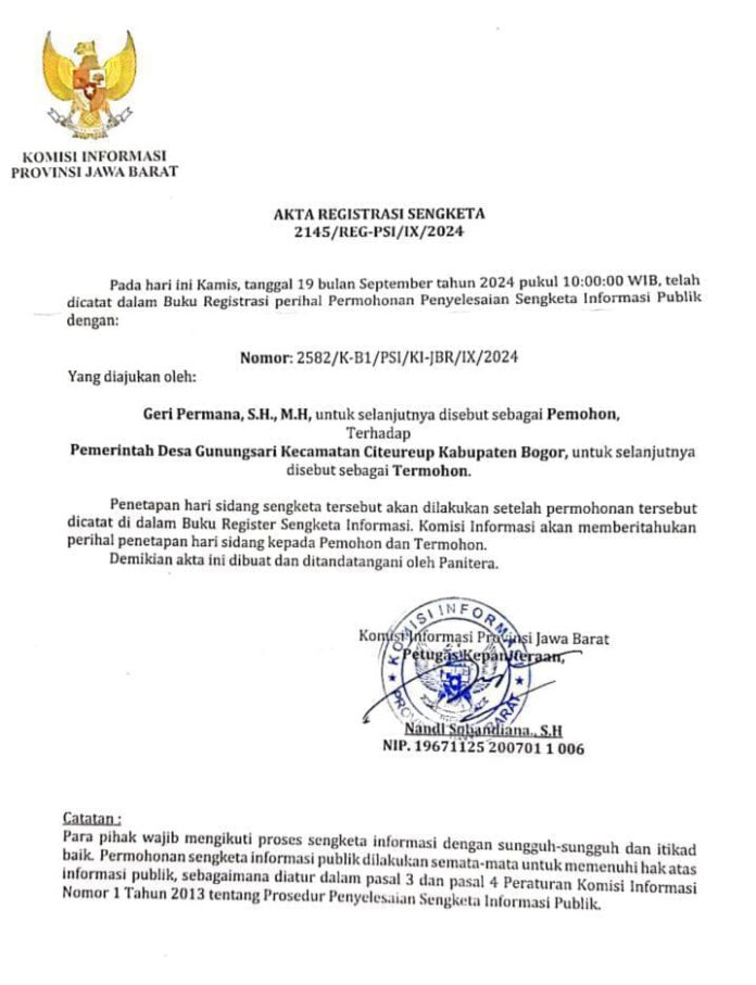 Kabupaten Bogor, monitorjabarnews.com – Aktivis Hak Asasi Manusia yang juga merupakan Mahasiswa Program Doktor (S3) Ilmu Hukum Universitas Nasional, Geri Permana secara resmi menggugat Pemerintah Desa Gunungsari, Kecamatan Citeureup, Kabupaten Bogor, melalui mekanisme Penyelesaian Sengketa Informasi yang teregistrasi di Komisi Informasi Provinsi Jawa Barat dengan Nomor: 2582/K-B1/PSI/KI-JBR/IX/2024 tanggal 19 September 2024.