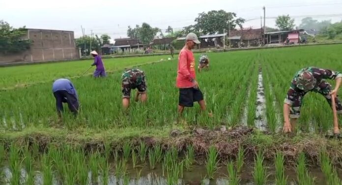 Sragen, Para Babinsa di Kec. Plupuh terus bergarak aktif membantu petani. Seperti Babinsa Koramil 20/Plupuh Kodim 0725/Sragen, Serda Jumadi yang turun langsung membantu petani dalam menanggulangi masalah gulma.