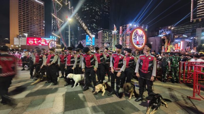 Jakarta — Korps Sabhara mengerahkan satuan K-9 untuk memperkuat pengamanan malam pergantian Tahun Baru di kawasan Bundaran Hotel Indonesia, Rabu (31/12/2025) malam. Pengamanan dilakukan guna memastikan situasi tetap aman dan kondusif di tengah tingginya aktivitas masyarakat.