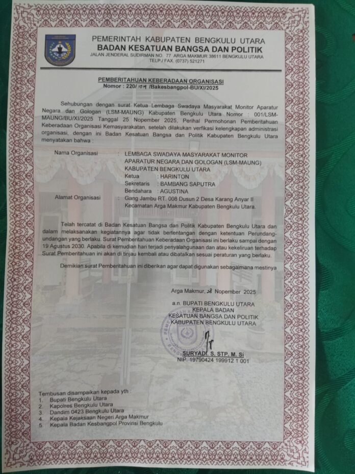 Bengkulu Utara — Dewan Pimpinan Cabang (DPC) LSM MAUNG yang juga dikenal dengan julukan ‘MAUNG Bodas” Bengkulu Utara telah melaksanakan pelaporan keberadaan ke Kantor Kesatuan Bangsa dan Politik (Kesbangpol) Kabupaten Bengkulu Utara pada 28 November 2025 yang lalu. Kunjungan delegasi ini disambut langsung oleh Kepala Kesbangpol Kabupaten Bengkulu Utara, Bapak SURYADI, S. STP. M. Si.