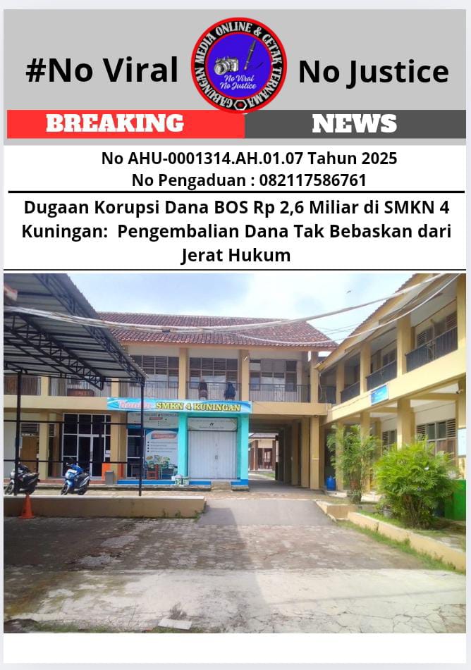 KUNINGAN, monitorjabarnews.com – 15 Juli 2025 – Skandal dugaan penyimpangan pengelolaan Dana BOS dan BOPD tahun 2022 senilai Rp2.646.000.000 di SMKN 4 Kuningan, Jawa Barat, kembali mengungkap lemahnya penegakan hukum di sektor pendidikan. Meskipun Kepala Sekolah, Drs. Ahmad Suryana, mengklaim telah mengembalikan dana tersebut secara bertahap hingga akhir Desember 2024, temuan Badan Pemeriksa Keuangan Republik Indonesia (BPK RI) ini menunjukkan kekurangan transparansi dan potensi pelanggaran hukum yang serius. Informasi ini didapatkan oleh Gabungan Media Online dan Cetak Ternama (GMOCT) dari media online Kabarsbi, yang juga tergabung dalam GMOCT.