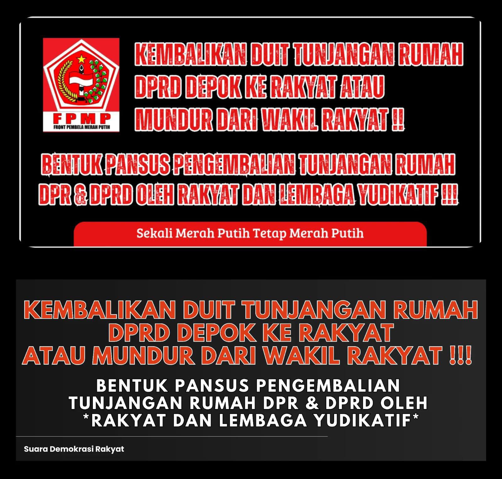 Depok, monitorjabarnews.com  – Front Pembela Merah Putih (FPMP) mendesak agar anggota DPRD Depok mengembalikan uang tunjangan Perumahan yang telah diterima ke rakyat.