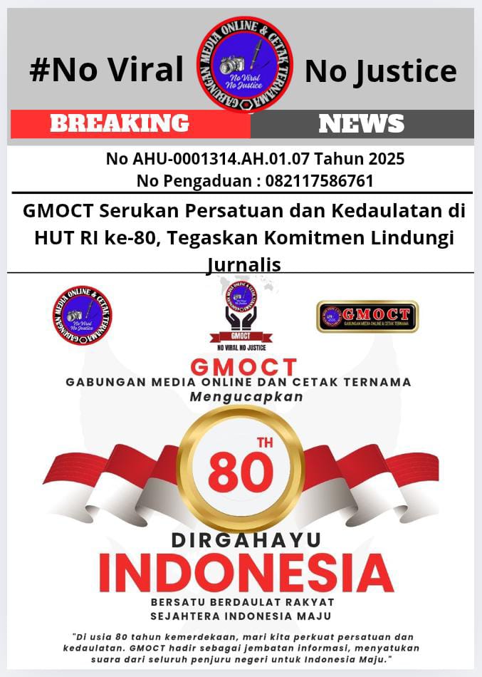 Kabupaten Semarang, monitorjabarnews.com –  Minggu 17 Agustus 2025 – Gabungan Media Online dan Cetak Ternama (GMOCT) turut merayakan Hari Ulang Tahun (HUT) ke-80 Republik Indonesia dengan semangat persatuan dan kedaulatan. Organisasi ini menegaskan komitmennya untuk menjadi jembatan informasi yang menyatukan suara dari seluruh penjuru negeri demi Indonesia Maju.