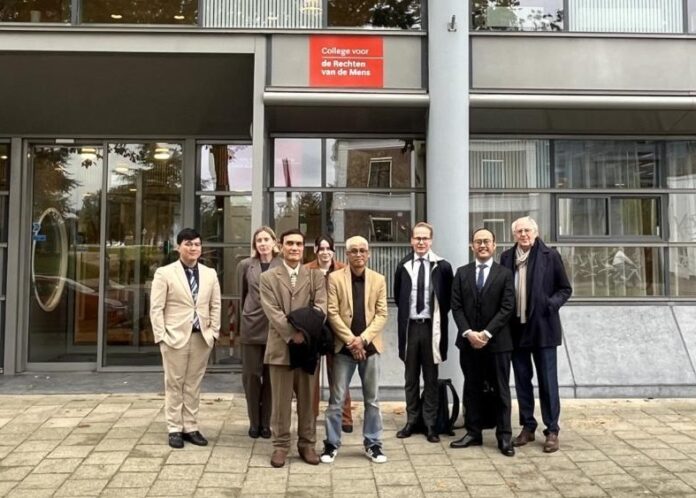 Keterangan foto, dari kiri ke kanan: Michael de Castro (pengacara dari Filipina), Sarah Stapel (pengacara dari Belanda), Bremi A. Lawendatu (pelaut asal Indonesia), Maxime Eljon (pengacara dari Belanda), Rolan F. Garrido (pelaut asal Filipina), Frank Peters (pengacara dari Belanda), Gede Aditya Pratama (pengacara dari Indonesia), dan Kees van Ast (Yayasan Equal Justice Equal Pay) berfoto di depan Institut Hak Asasi Manusia Belanda.