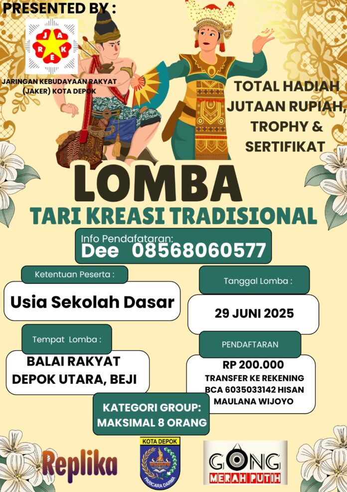 Depok, monitorjabarnews.com – Jaringan Kebudayaan Rakyat Kota Depok Menggelar ajang perlombaan “Tari Kreasi Tradisional” tingkat usia Sekolah Dasar se-kota Depok, di Balai Rakyat Depok Utara, Beji pada 29 Juni 2025.