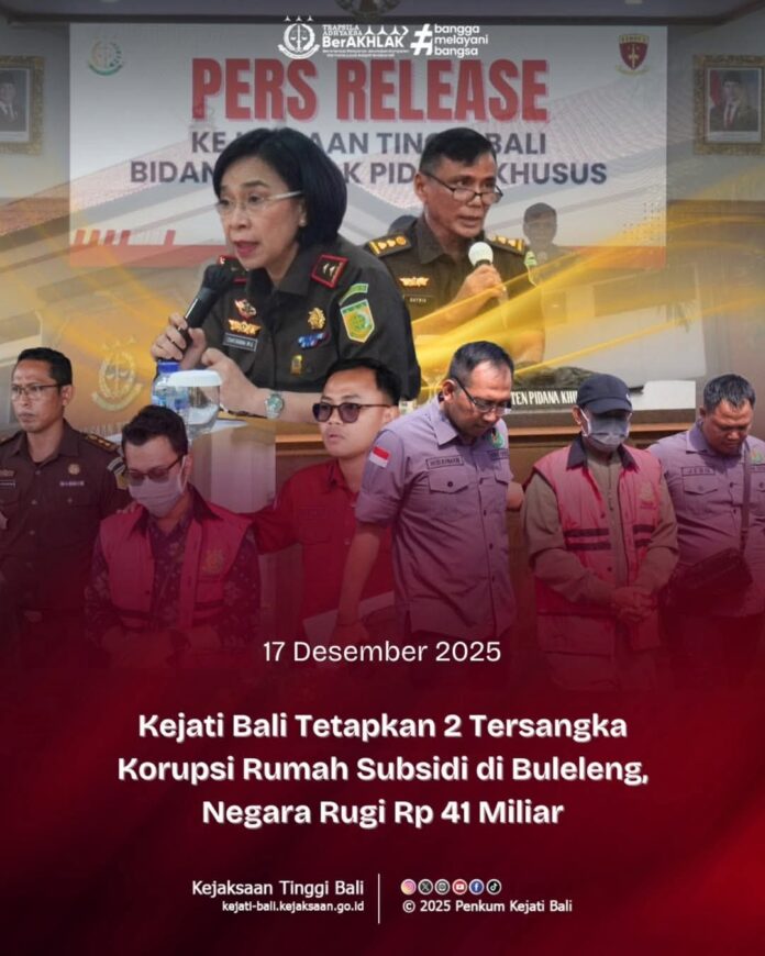 Kejaksaan Tinggi (Kejati) Bali resmi menetapkan dua orang tersangka dalam kasus dugaan tindak pidana korupsi penyaluran bantuan rumah bagi Masyarakat Berpenghasilan Rendah (MBR) di Kabupaten Buleleng tahun anggaran 2021-2024. Pengumuman penetapan tersangka ini disampaikan langsung di hadapan awak media di Aula Sasana Dharma Adhyaksa, Kantor Kejati Bali, Rabu, 17 Desember 2025.