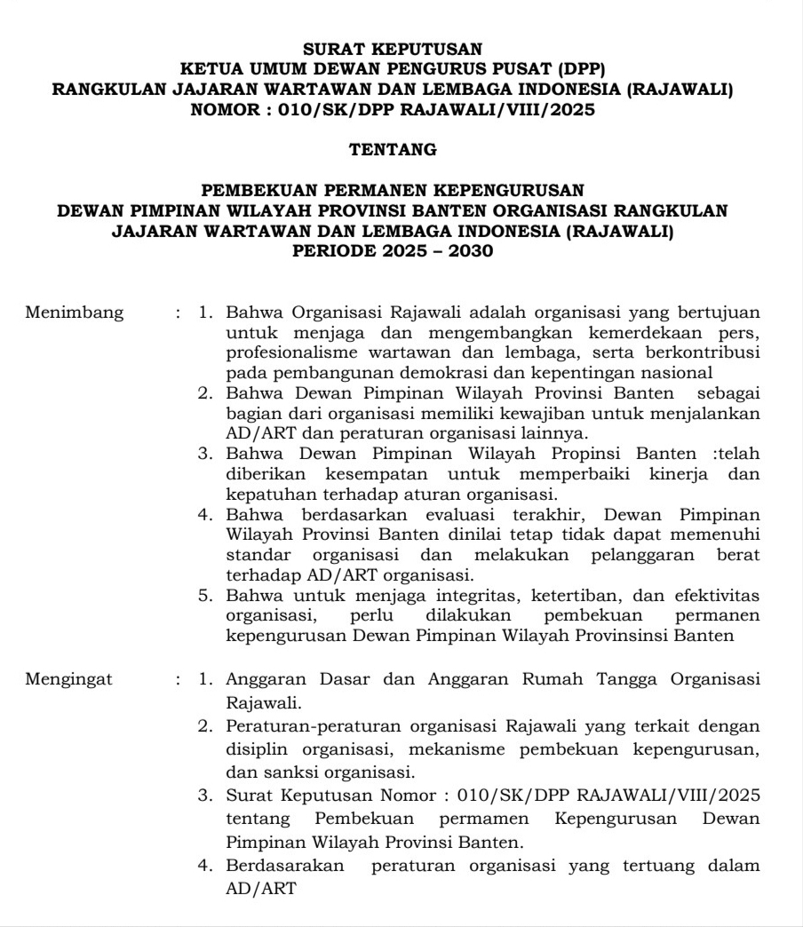 Dengan pemberhentian ini, kami berharap semua pihak terkait dapat memahami bahwa segala tindakan yang mengatasnamakan DPW Banten oleh pihak yang bersangkutan setelah tanggal 21 Agustus 2025 tidak lagi memiliki legitimasi organisasi. “Hal ini kami sampaikan agar tidak terjadi kesalahpahaman dan menjaga ketertiban administrasi serta citra organisasi” Sambungnya