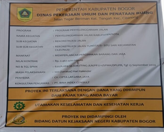 Cilengsi, monitorjabarnews.com – Pekerjaan ruas jalan Mampir – situ sari yang dikerjakan oleh Cv. Cipta Laksana Jaya dengan nomor kontrak : 620/A.069-3087/ TING-JLN/PPJJ-1/SPMK/DPUPR 13 september 2024 dengan nilai Rp. 2.467.470.000,00 dengan konsultan pengawas Pt. Bina indeks consult.