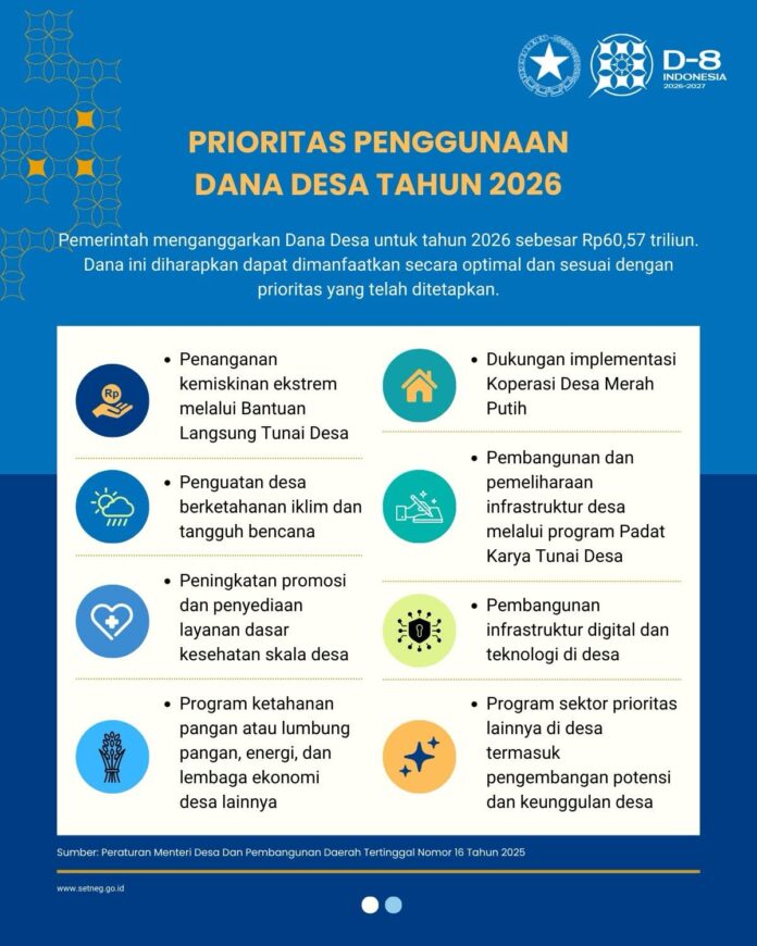 Jakarta, Pemerintah secara resmi menetapkan prioritas penggunaan Dana Desa tahun 2026 dengan total anggaran mencapai Rp60,57 triliun. Fokus utama penggunaan dana ini diarahkan untuk mendukung pemulihan ekonomi dan peningkatan kesejahteraan masyarakat desa, mulai dari penanganan kemiskinan ekstrem melalui BLT Desa hingga dukungan implementasi Koperasi Desa Merah Putih.