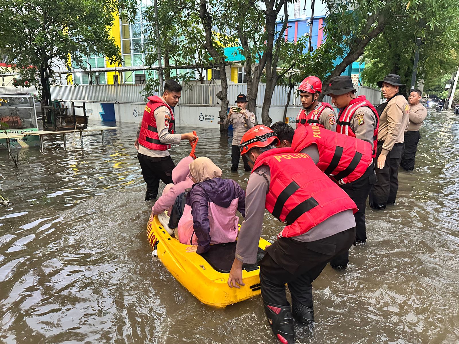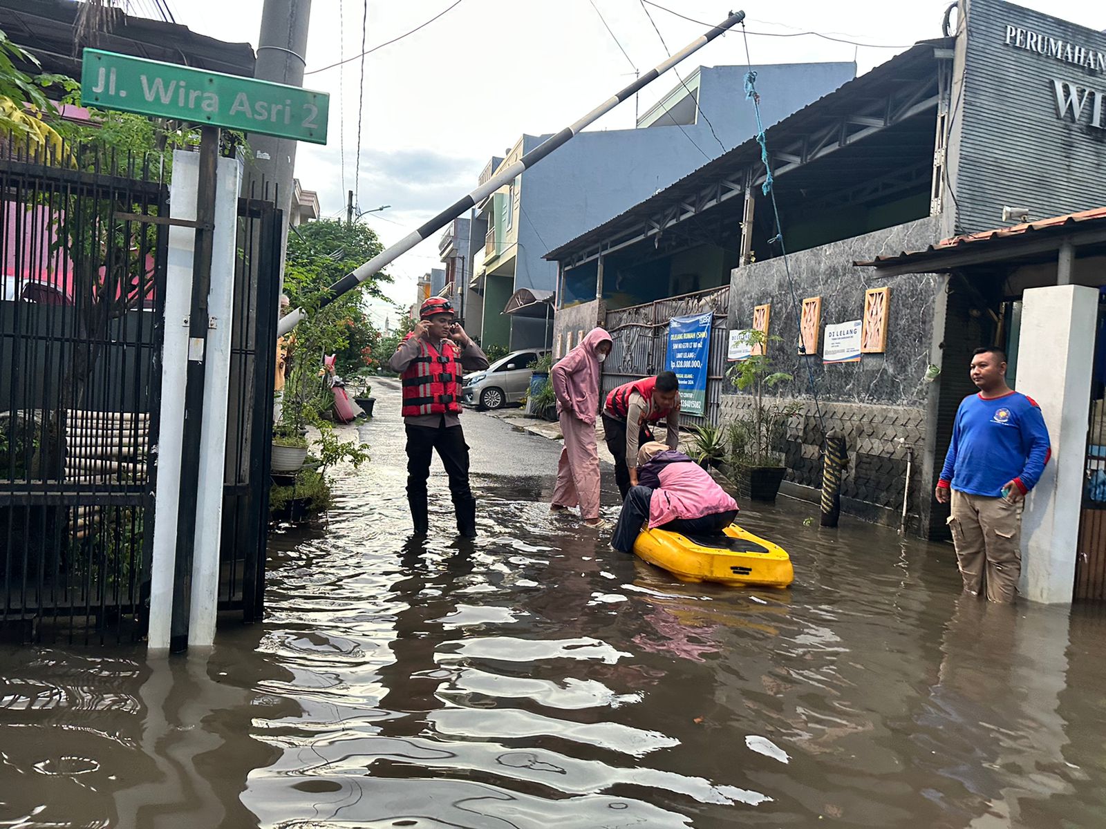 Perlengkapan Pelampung dan Helm Rescue guna memastikan keamanan petugas dan warga yang ditolong dan Aksi sigap ini membuktikan komitmen Detasemen Perintis dalam menjalankan tugasnya sebagai abdi negara untuk masyarakat.