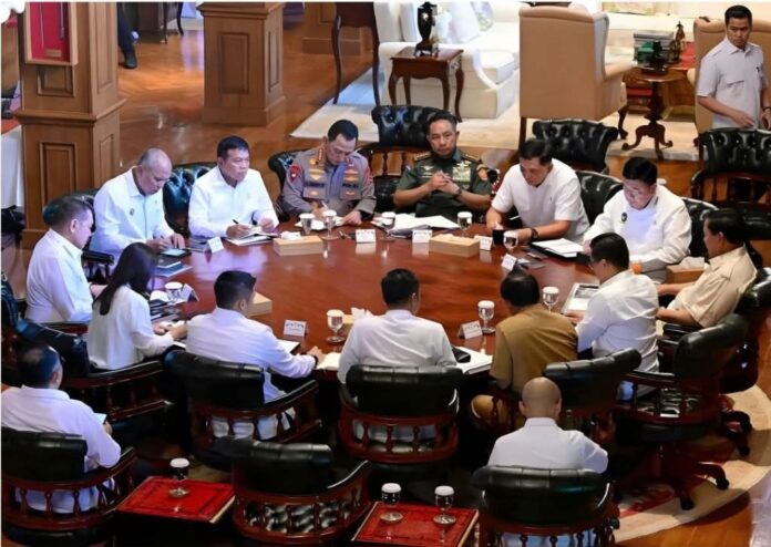 Kabupaten Bogor, monitorjabarnews.com Presiden Prabowo Subianto menggelar rapat terbatas di kediamannya di Hambalang, Kabupaten Bogor, pada Minggu (23/11/2025), dengan fokus utama membahas penanganan kawasan tambang dan hutan ilegal yang selama ini sulit dijangkau aparat. Dalam pertemuan tersebut, Prabowo menekankan pentingnya langkah terpadu lintas kementerian dan lembaga agar penegakan hukum dapat berjalan efektif, terutama di wilayah rawan pelanggaran.