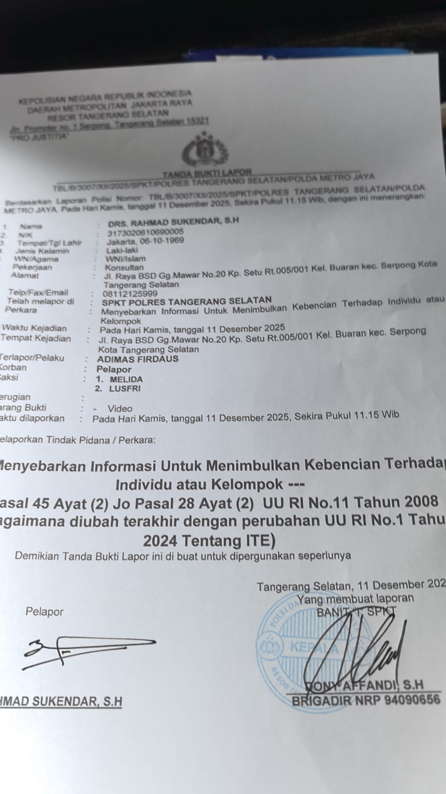 Ia memastikan dengan adanya Laporan Polisi Nomor : LP. TBL. 3007/ XII/2025/SPKT Polres Tangerang Selatan, tanggal 11 Desember 2025