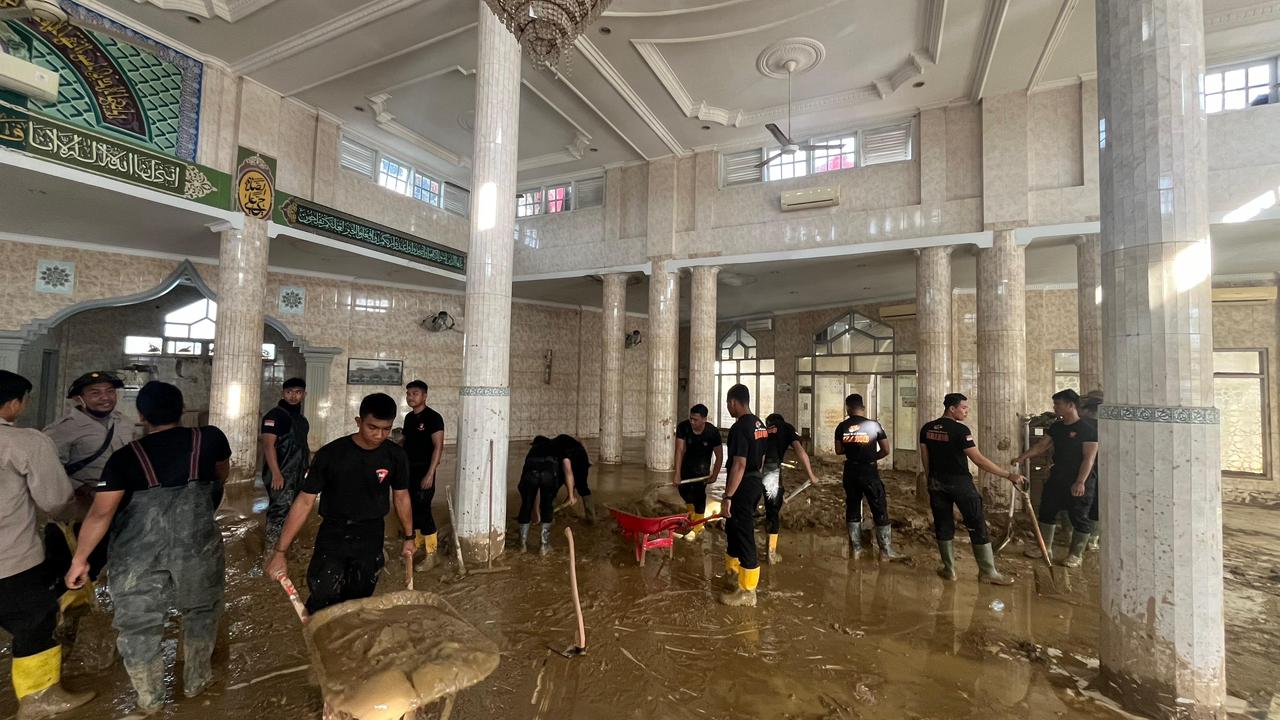Aceh – Personel Polri dan masyarakat turut bersama-sama bekerjasama membersihkan Masjid Syuhada di Aceh Tamiang. Tempat ibadah tersebut tidak bisa digunakan lantaran terendam lumpur.